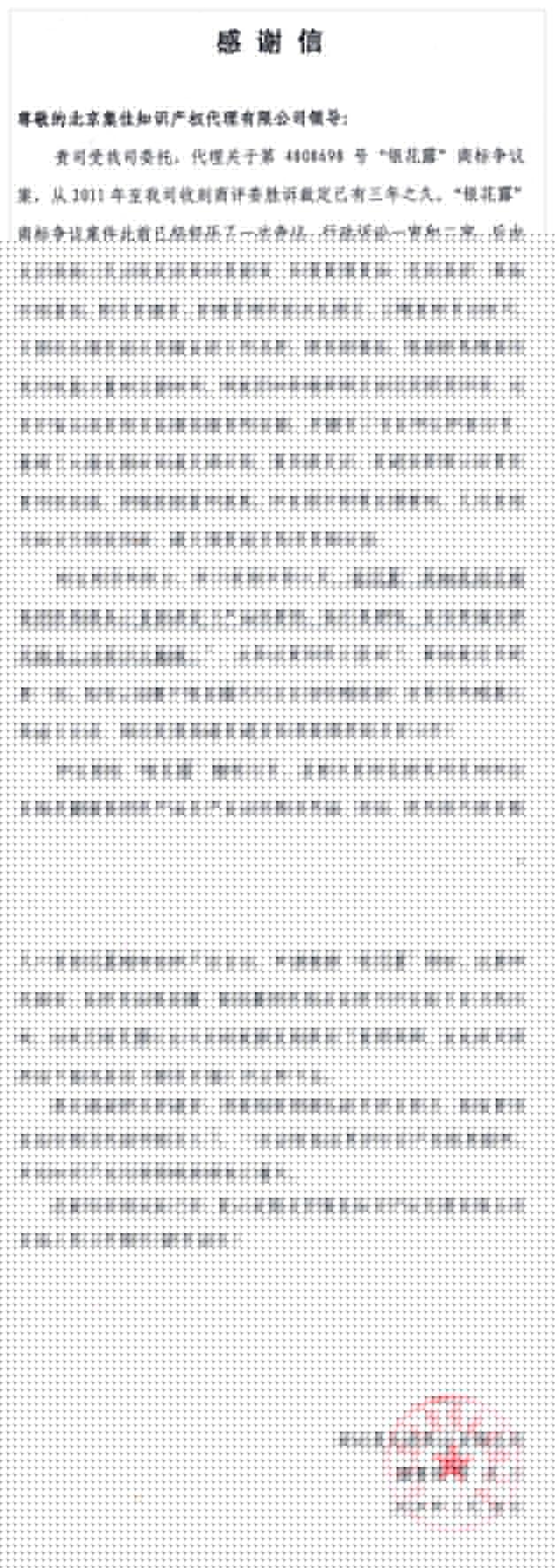 在新年即將到來之際,湖北楚天舒藥業有限公司給集佳發來感謝信,并提前祝福集佳全體人員新年快樂,工作順利。 集佳律師曾代理該公司第4808698 號"銀花露"商標爭議案獲得全面勝利。該案案情復雜、經歷曲折、準備時間緊迫,該案的勝訴,在所有金銀花露、銀花露飲料等企業同行中引起了巨大的凡響,為銀花露行業今后的健康發展提供了重要保障。
