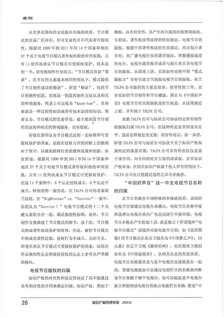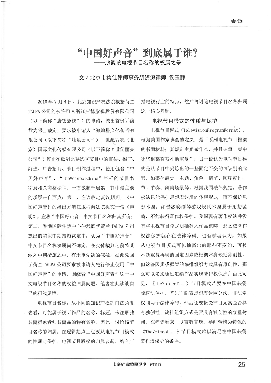 集佳資深律師侯玉靜文章《“中國好聲音”到底屬于誰?——淺談該電視節(jié)目名稱的權(quán)屬之爭》在《知識產(chǎn)權(quán)管理評論》發(fā)表