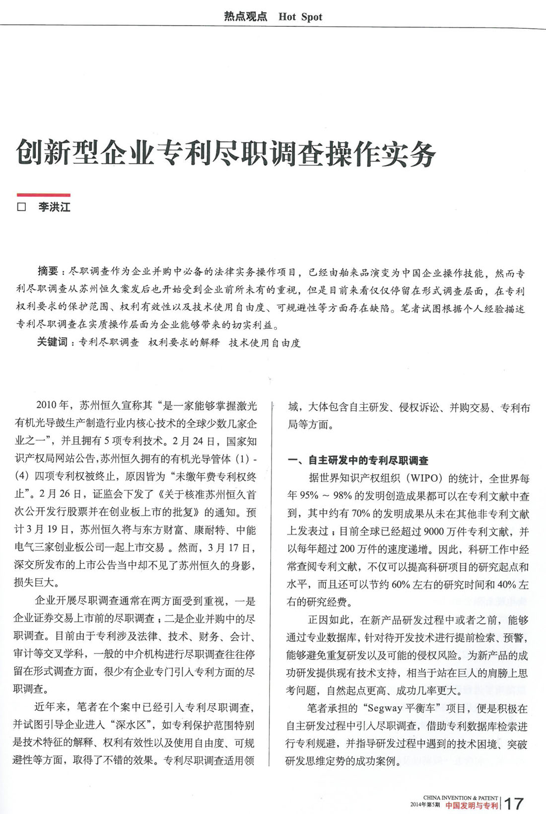 集佳律師撰文《創新性企業專利盡職調查操作實務》被《中國發明與專利》發表