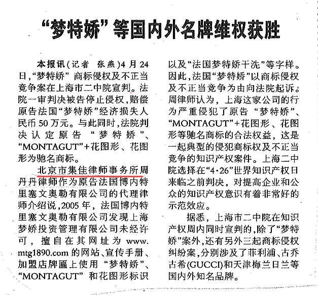 《名牌時報》:“夢特嬌”等國內外名牌維權獲勝