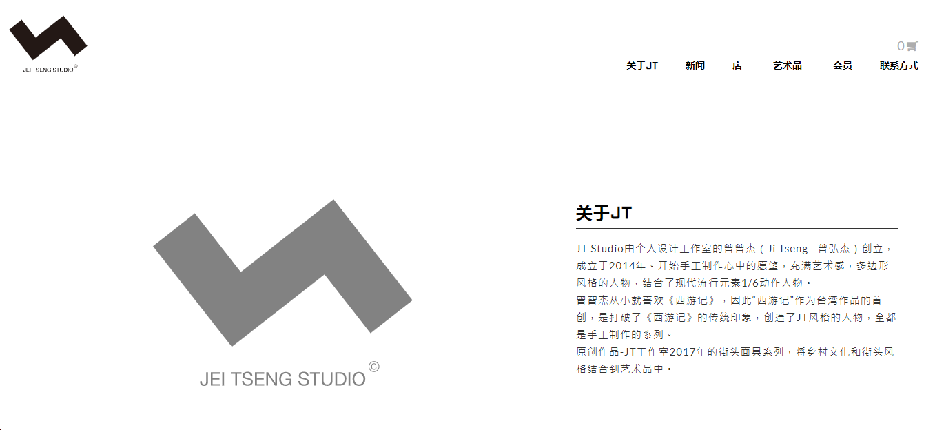 站酷ZCOOL網(wǎng)站中作者主頁(yè)顯示個(gè)人工作室官方網(wǎng)站為www.jtstudio.com.tw,異議人隨案提供了異議人個(gè)人工作室官網(wǎng)打印件,官網(wǎng)首頁(yè)顯示如下信息:JT Studio由個(gè)人設(shè)計(jì)工作室的曾弘杰(Jei Tseng 曾弘杰)創(chuàng)立,成立于2014年。開始手工制作心中的愿望,充滿藝術(shù)感,多邊形風(fēng)格的人物,結(jié)合了現(xiàn)代流行元素1/6動(dòng)作人物。曾弘杰從小就喜歡《西游記》,因此“西游記”作為臺(tái)灣作品的首創(chuàng),是打破了《西游記》的傳統(tǒng)印象,創(chuàng)造了JT風(fēng)格的人物,全都是手工制作的系列。原創(chuàng)作品-JT工作室2017年的街頭面具系列,將鄉(xiāng)村文化和街頭風(fēng)格結(jié)合到藝術(shù)品中。