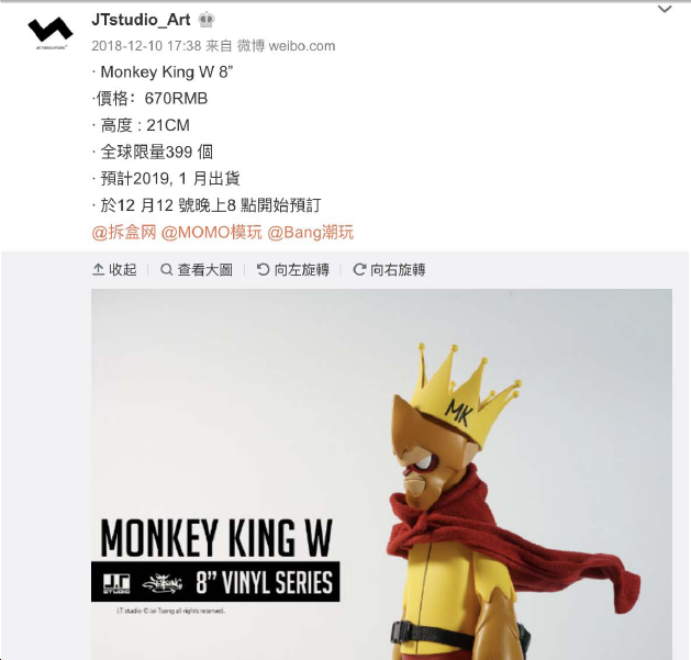 異議人站酷ZCOOL網(wǎng)站的個(gè)人主頁(yè)(https://www.zcool.com.cn/u/2732656/profile#tab_anchor)顯示,J.T studio是由異議人曾弘杰(英文名Jei Tseng)2014年在中國(guó)臺(tái)灣所創(chuàng)立的個(gè)人工作室,曾弘杰畢業(yè)于設(shè)計(jì)學(xué)院,喜歡畫畫及創(chuàng)作,自幼就很喜歡西游記的故事,因此將西游記系列作為第一個(gè)系列作品,將現(xiàn)代流行元素結(jié)合中國(guó)文化、漫畫風(fēng)格的手工藝術(shù)創(chuàng)作。異議人在站酷ZCOOL網(wǎng)站擁有11371位粉絲,人氣值高達(dá)1887444。