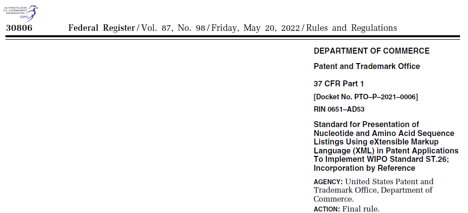 2022年5月20日,美國專利商標局(USPTO)發布了一項最終規則,對2022年7月1日或之后向USPTO提交的申請中的核苷酸和氨基酸序列表(Sequence Listing)實施 WIPO ST.26標準,以及對其他實施細則進行相應修訂(參見聯邦公報30806)。該最終規則基于并明確納入WIPO ST.26標準的相關部分,創建了新規則,即新的37 CFR 1.831-1.835。此外,37 CFR 1.821-1.834通過引用特別納入了WIPO標準ST.26的某些規定。
