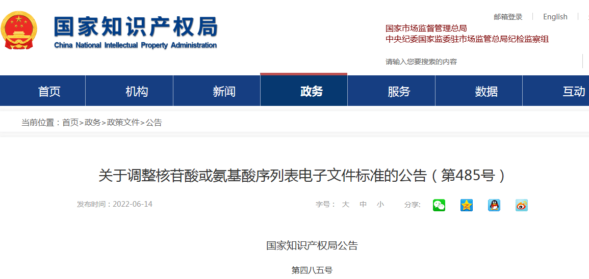 國家知識產權局(CNIPA)于2022年6月14日發布了“關于調整核苷酸或氨基酸序列表電子文件標準的公告(第485號)”,自2022年7月1日起,向國家知識產權局提交的國家專利申請和PCT國際申請,專利申請文件中含有序列表的,該序列表電子文件應符合WIPO ST.26標準要求。此外,專利申請人以電子形式提交國家專利申請,在提交符合WIPO ST.26標準的序列表電子文件時,為核算說明書附加費用,應同時提交一份PDF格式的序列表文件。