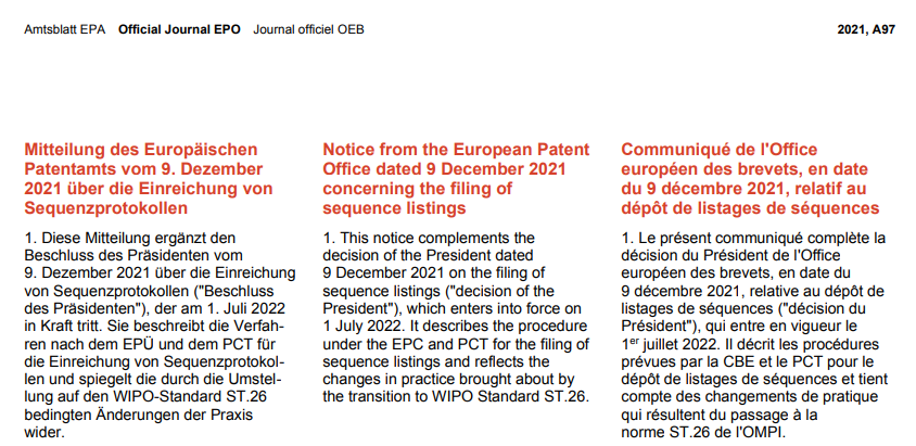 歐洲專利局(EPO)也在2021年12月09日進行了公告,要求自2022年7月1日起向EPO提交的國家專利申請和PCT國際申請的序列表電子文件應符合WIPO ST.26標準要求。申請日在2022年7月1日之前的申請仍需采用WIPO ST.25標準。