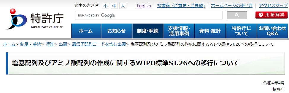 日本專利局(JPO)也進行了公告,要求自2022年7月1日起向JPO提交的國家專利申請和PCT國際申請的序列表電子文件應符合WIPO ST.26標準要求。