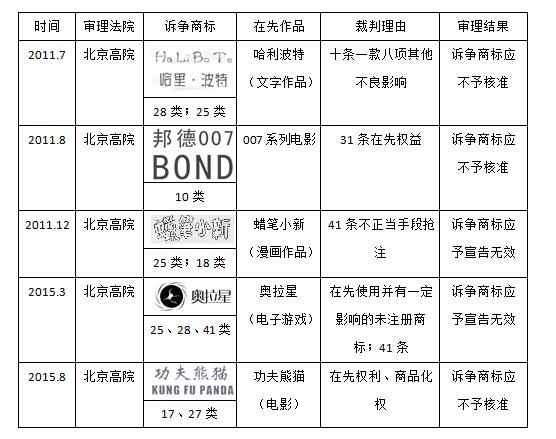 對于這種權(quán)利沖突類型,最初因缺少明確的法律規(guī)制,對在先作品名稱不予保護的情況并不少見;但隨著遏制惡意搶注的加強,商標禁注的“絕對條款”開始被適用,比如援引“其他不良影響”條款不予注冊的“哈里波特”,再比如援引“不正當(dāng)手段搶注”條款不予注冊的“蠟筆小新”。但用“絕對條款”保護相對權(quán)利畢竟有些名不正言不順,北京高院藉由“邦德007”、“功夫熊貓”兩案,首次將在先影視作品名稱、角色名稱作為在先權(quán)益進行保護,引導(dǎo)適用“相對條款”而不是“絕對條款”來解決這種沖突。在此期間,也有類似“奧拉星”的案件,適用“在先使用并有一定影響的未注冊商標”條款來保護在先游戲名稱。本文附表一總結(jié)了近年來北京法院在商標授權(quán)確權(quán)類案件中保護在先各類作品名稱的情況,供讀者參考。