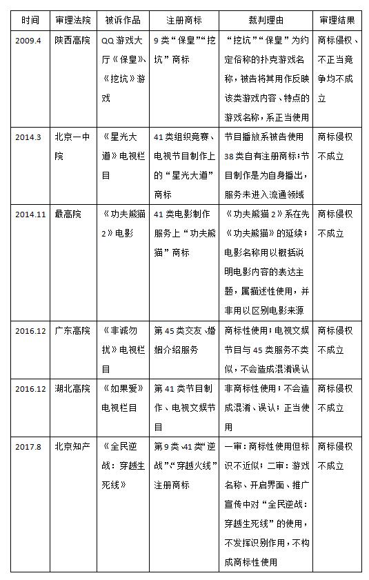 在已決案例中,一部作品的名稱——作品的類型無論是影視節(jié)目還是游戲——如果和在先注冊的商標重合了,很少認定商標侵權(quán)成立的,理由大概有三種:第一,作品名稱并非商標性使用,比如被訴侵權(quán)的《功夫熊貓》電影、《如果愛》電視欄目、《全民逆戰(zhàn)——穿越生死線》游戲;第二,作品與在先注冊商標核定的商品或服務(wù)不類似,比如被訴侵權(quán)的《星光大道》電視欄目、《非誠勿擾》電視欄目;第三,在先注冊商標標識,相對于作品的內(nèi)容、主題等特點來說具有直接的描述性,不能禁止他人正當(dāng)使用,比如被訴侵權(quán)的《挖坑》、《保皇》游戲。商品類似問題和正當(dāng)使用問題,涉及到商標標識及作品的諸多具體細節(jié),個案性很強;但商標性使用問題,幾乎是所有涉及這類沖突的案件中難以繞開的爭議焦點。本文附表二,總結(jié)了各地法院對此類案件的審理情況。