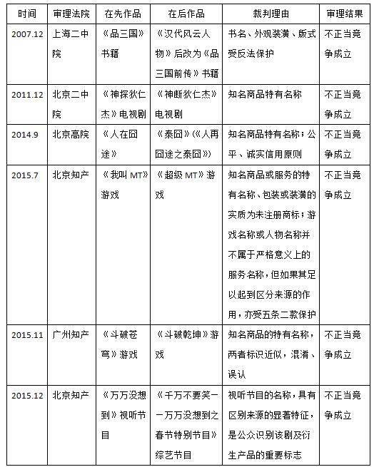 如上所述,這種沖突類型實際上是比較典型的仿冒之訴。這種沖突發(fā)生在同類作品之間,與發(fā)生在同類商品或服務(wù)之間,并沒有實質(zhì)上的區(qū)別。此類案件審理的難點在于,能否把原告主張的影視名稱、游戲名稱等作品名稱作為反不正當(dāng)競爭法第五條第二項下的“知名商品的特有名稱”進行保護。在武漢華旗訴光線傳媒、徐崢《泰囧》一案中,法院同時適用了反法第五條第二項和第二條公平、誠實信用原則條款,以第二條原則性條款來補強適用第五條第二項稍顯牽強的缺憾;在北京知識產(chǎn)權(quán)法院審理的《我叫MT》一案中,法院也注意到“游戲名稱或人物名稱并不屬于嚴格意義上的服務(wù)名稱”,但認為可以將“知名商品/服務(wù)名稱”擴大到游戲名稱、人物名稱,條件是“其足以起到區(qū)分來源的作用”。本文附表四總結(jié)了此類案件的審理情況,供讀者參考。