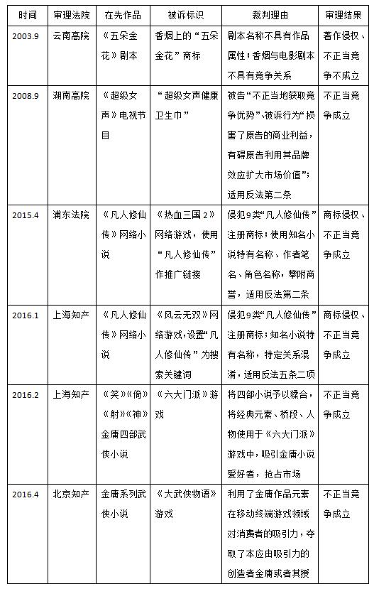 這種類型的案件目前數(shù)量不多,但可以預(yù)見,將文化轉(zhuǎn)化為商業(yè)力量已經(jīng)是文化傳媒產(chǎn)業(yè)的大趨勢,隨之而來的類似案件將會急劇增加。從已決的案件結(jié)果看,對于在先作品名稱的商業(yè)化利用問題,司法判決已經(jīng)從不保護逐漸轉(zhuǎn)向保護;在法律適用方面,較多的案例引用反不正當(dāng)競爭法第二條的一般條款進行判決,也存在個案適用反不正當(dāng)競爭法第五條第二項。筆者認為,將他人在先作品名稱作為自身商品或服務(wù)的標識使用,確實可能會使人誤認為該商品或服務(wù)與作品權(quán)利人之間存在授權(quán)許可、合作等特定關(guān)系,但這種認知不同于商品或服務(wù)來源的混淆,與反法仿冒意義上的混淆、誤認還是存在明顯區(qū)別。何況,反法第五條的保護范圍通常是在類似商品或服務(wù)的范圍之內(nèi),將這一條款擴大適用到作品的衍生商品或服務(wù)范圍,稍顯牽強。因此,在反法第五條修改之前,適用第二條一般性條款似乎更為適當(dāng)。本文附表五總結(jié)了此類案件的審理情況,供讀者參考。