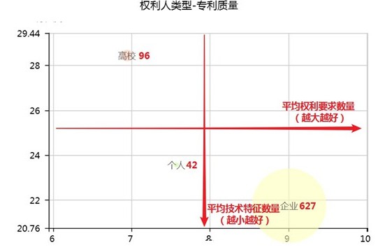 下圖為企業、高校、個人三種不同類型的權利人的專利質量氣泡。橫坐標為平均權利要求數量,縱坐標為平均技術特征數量,氣泡大小為獲獎專利數量。