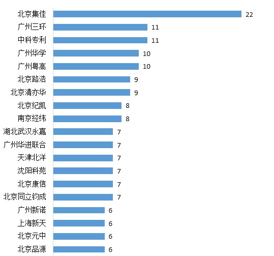 對獲獎專利的代理機構進行分析,發明、實用新型代理量方面,北京集佳知識產權代理有限公司以22件的專利代理量領跑專利代理行業,是第二名廣州三環和中科專利的兩倍。南方大所廣州三環、廣州華進聯合、廣州粵高排名居前。南京經緯、北京康信、北京路浩、武漢永嘉、北京品源、北京同立鈞成等專利代理機構緊隨其后。