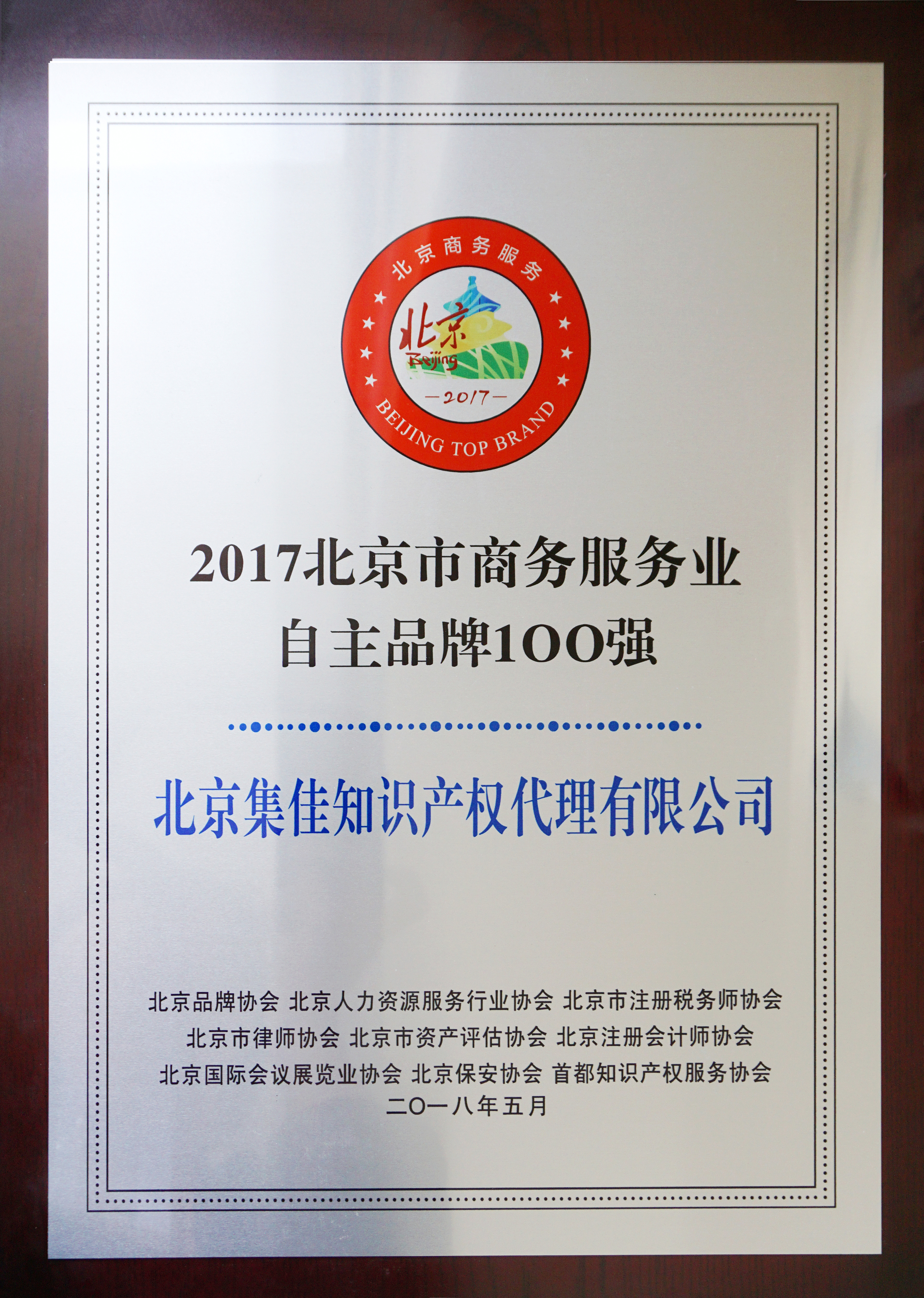 第五屆京交會期間,由北京市商務委員會主辦的“新時代北京商務服務業國際化、品牌化發展高峰論壇”在國家會議中心隆重舉行,論壇上,北京品牌協會秘書長夏明發布“2017年北京商務服務業自主品牌百強榜”,北京集佳知識產權代理有限公司斬獲殊榮。