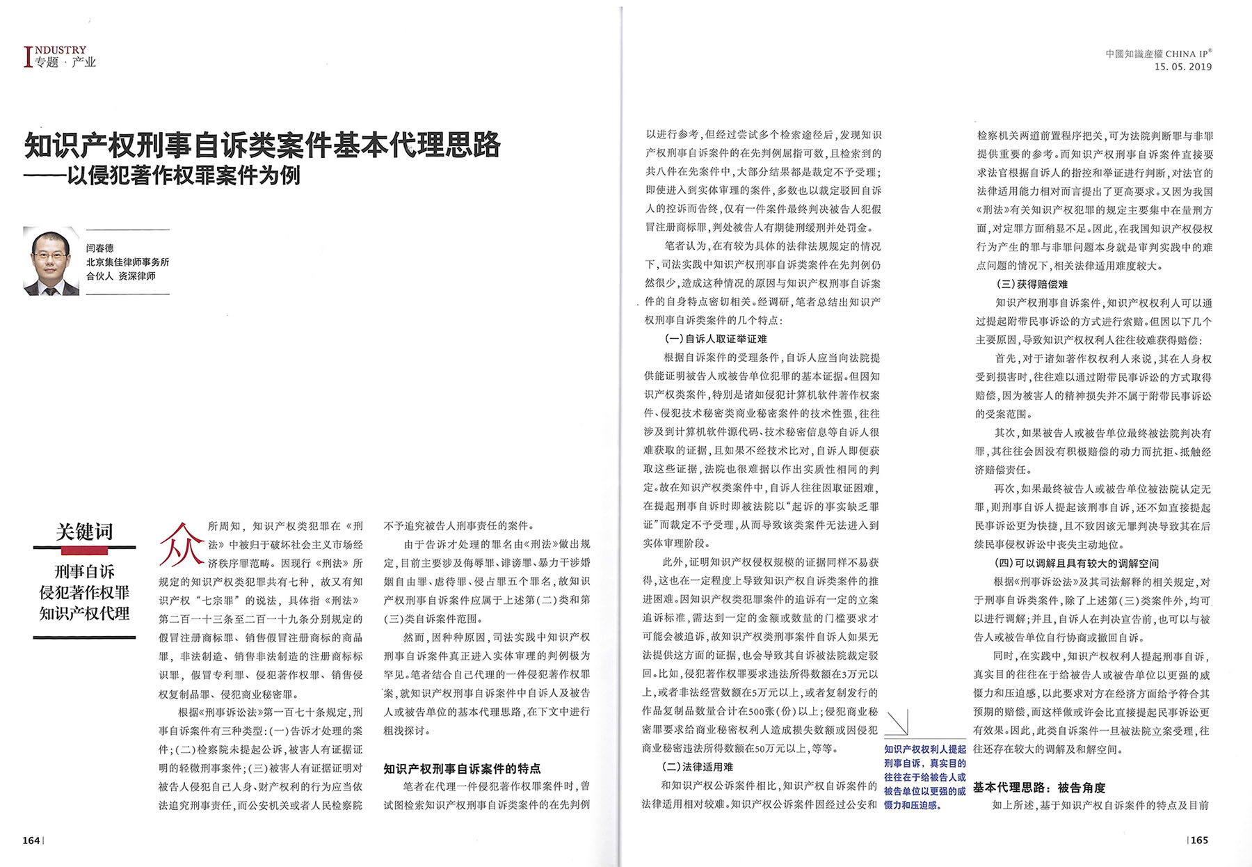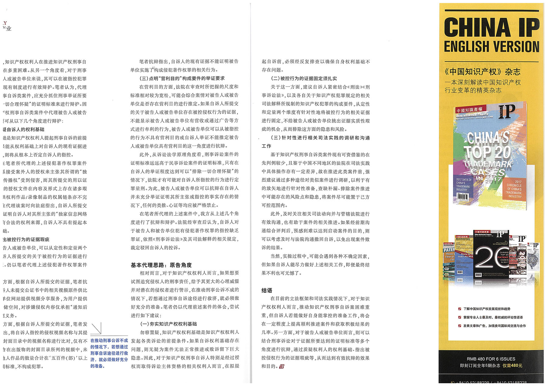 集佳文章《知識產權刑事自訴類案件基本代理思路—以侵犯著作權罪案件為例》在《中國知識產權》發表
