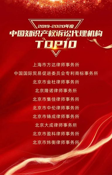 2020年12月2日,知識產權領域權威媒體知產力與知產寶重磅推出“2019-2020年度中國知識產權訴訟代理機構TOP 10”排行榜,北京市集佳律師事務所憑借其優質的服務、卓越的業務能力和處理疑難案件的突出能力,榮登TOP10榜單!