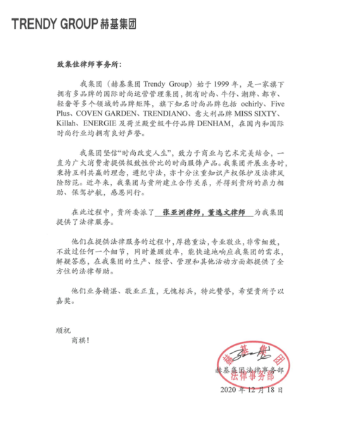 近日,集佳收到來自赫基集團的表揚信,信中,客戶對集佳張亞洲律師董逸文律師的辛勤付出表示感謝,為他們細致高效的專業服務、敬業正直的工作態度點贊!