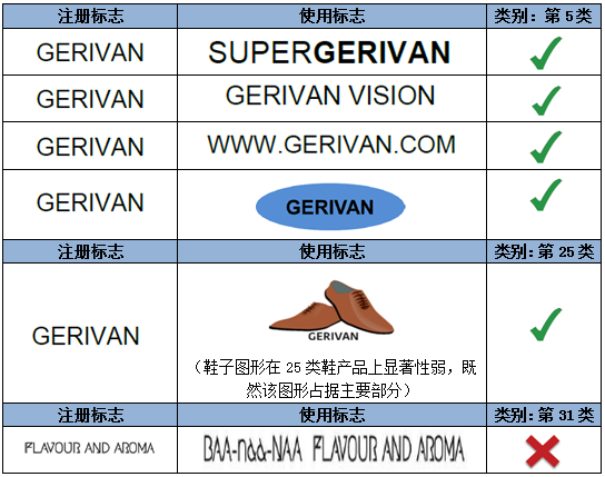 如上述示例,注冊商標指定在第32類礦泉水商品上,相較而言,圖形對指定商品具有一定暗示性,而顯著性較弱。因此,文字部分“GERIVAN”為該注冊商標的主要顯著部分。第一組中的使用標志僅是對圖形和文字的位置進行了調整,不影響文字部分的顯著性。而第二組的使用標志對文字進行了拆分,形成了新的商業印象,故視為實質變更。