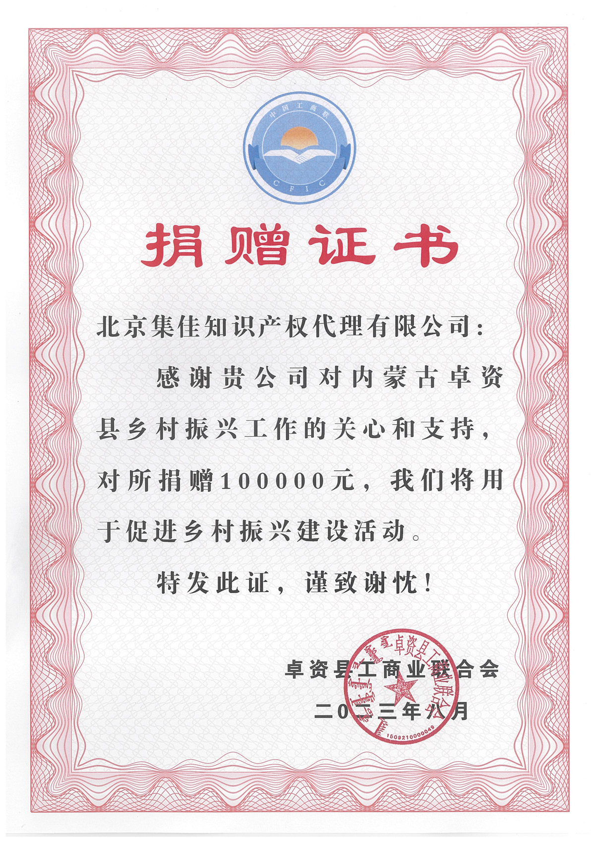 為進一步促進京蒙對口幫扶協作工作,近日,集佳積極響應朝陽區工商聯的倡議,參加京蒙對口幫扶考察工作,并捐資10萬元支持內蒙古自治區烏蘭察布市卓資縣鄉村振興建設。