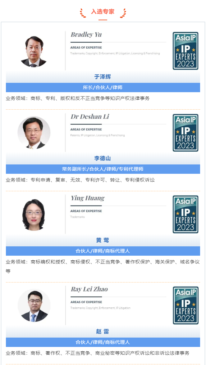 近日,國際權威知識產權媒體《亞洲知識產權》(Asia IP)發布了2023年度“中國知識產權專家百強榜”(Top 100 IP Experts in China),集佳于澤輝、李德山、黃鶯、趙雷、潘煒5位合伙人因其優質的專業服務及海內外業界與客戶的普遍認可榮登百強榜單!
