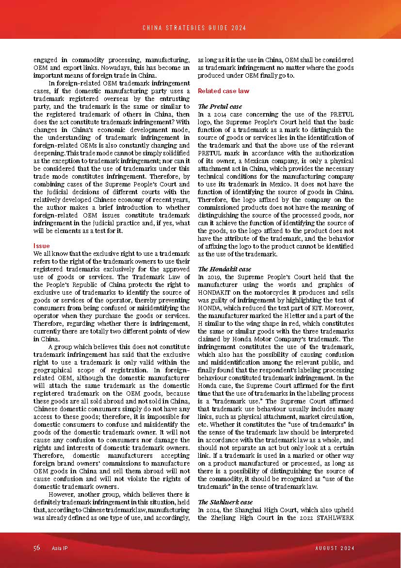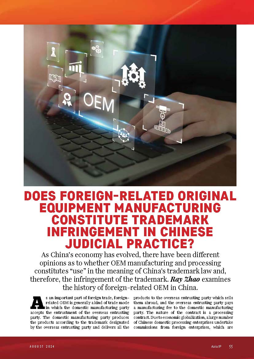 集佳文章《DOES FOREIGN-RELATED ORIGINAL EQUIPMENT MANUFACTURING CONSTITUTE TRADEMARK INFRINGEMENT IN CHINESE JUDICIAL PRACTICE?》在《Asia IP AUGUST 2024》發表